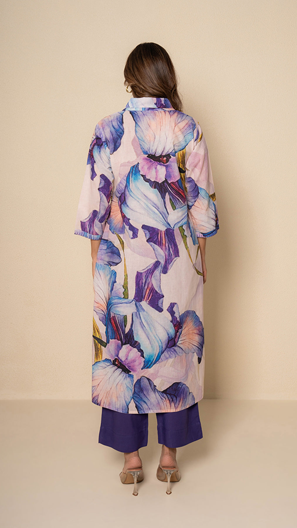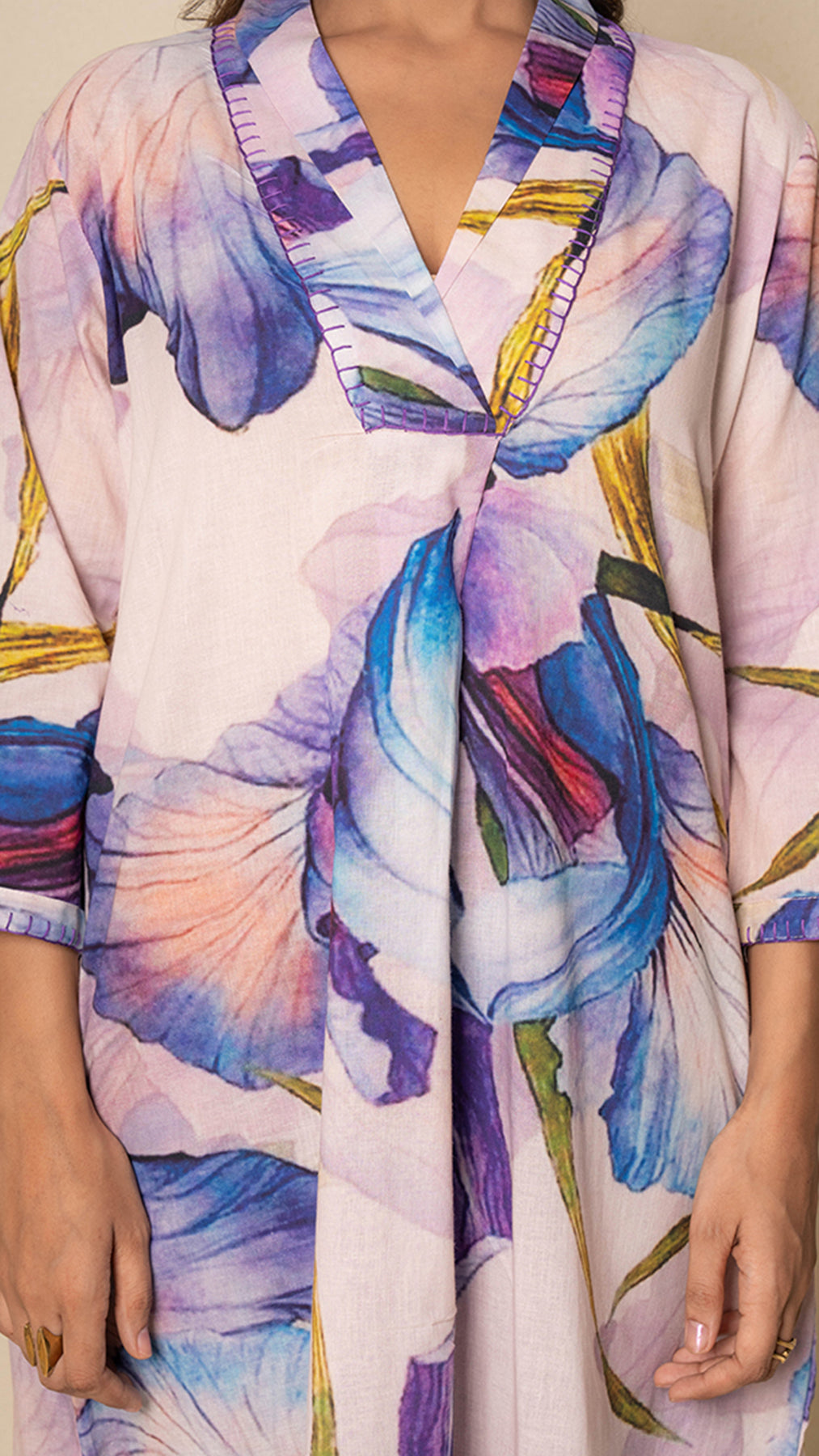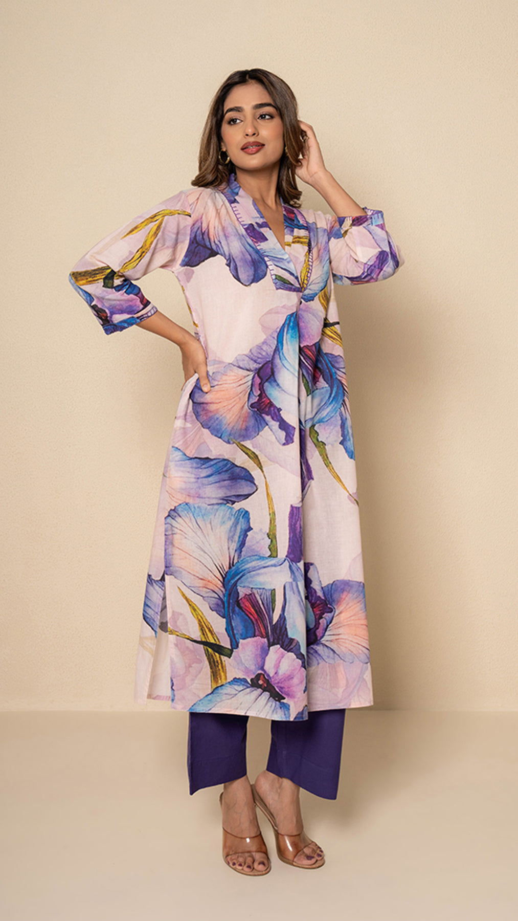 Celebrate vibrant elegance with our Floral Fiesta Cotton Kurta Set, designed to brighten up any occasion. The overlap V-neck collar and has a statement yoke that adds a contemporary twist, highlighted by intricate blanket stitch threadwork detailing that also adorns the sleeves. Crafted in soft cotton, the kurta features bold multicolor floral digital print over a soothing pale peach base, with side slits for ease and style. Paired with solid purple cotton pants, this ensemble perfectly balances playful color with refined charm.