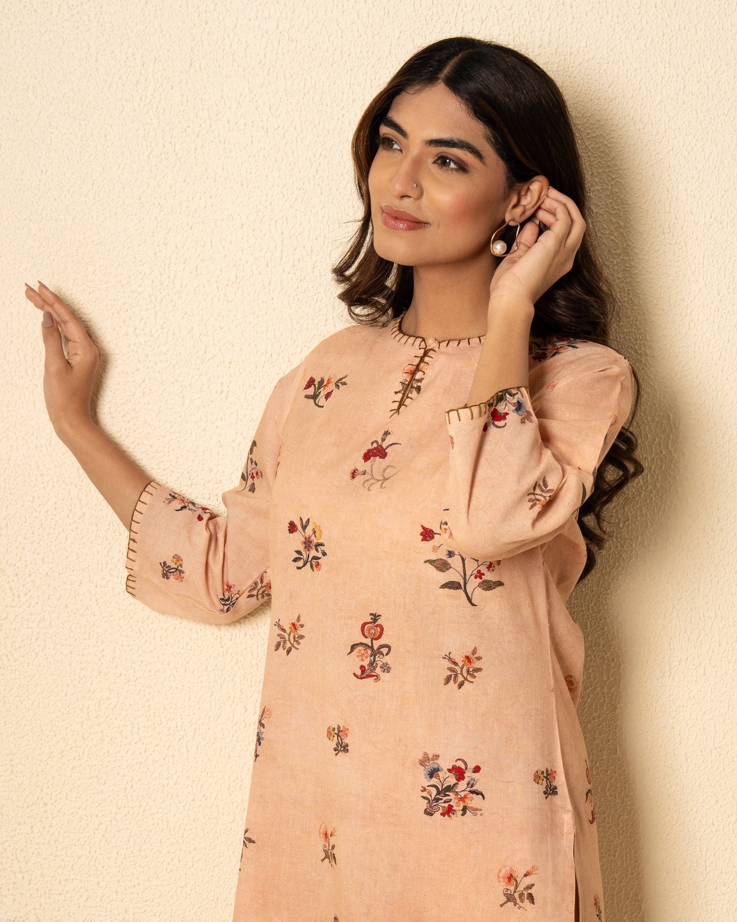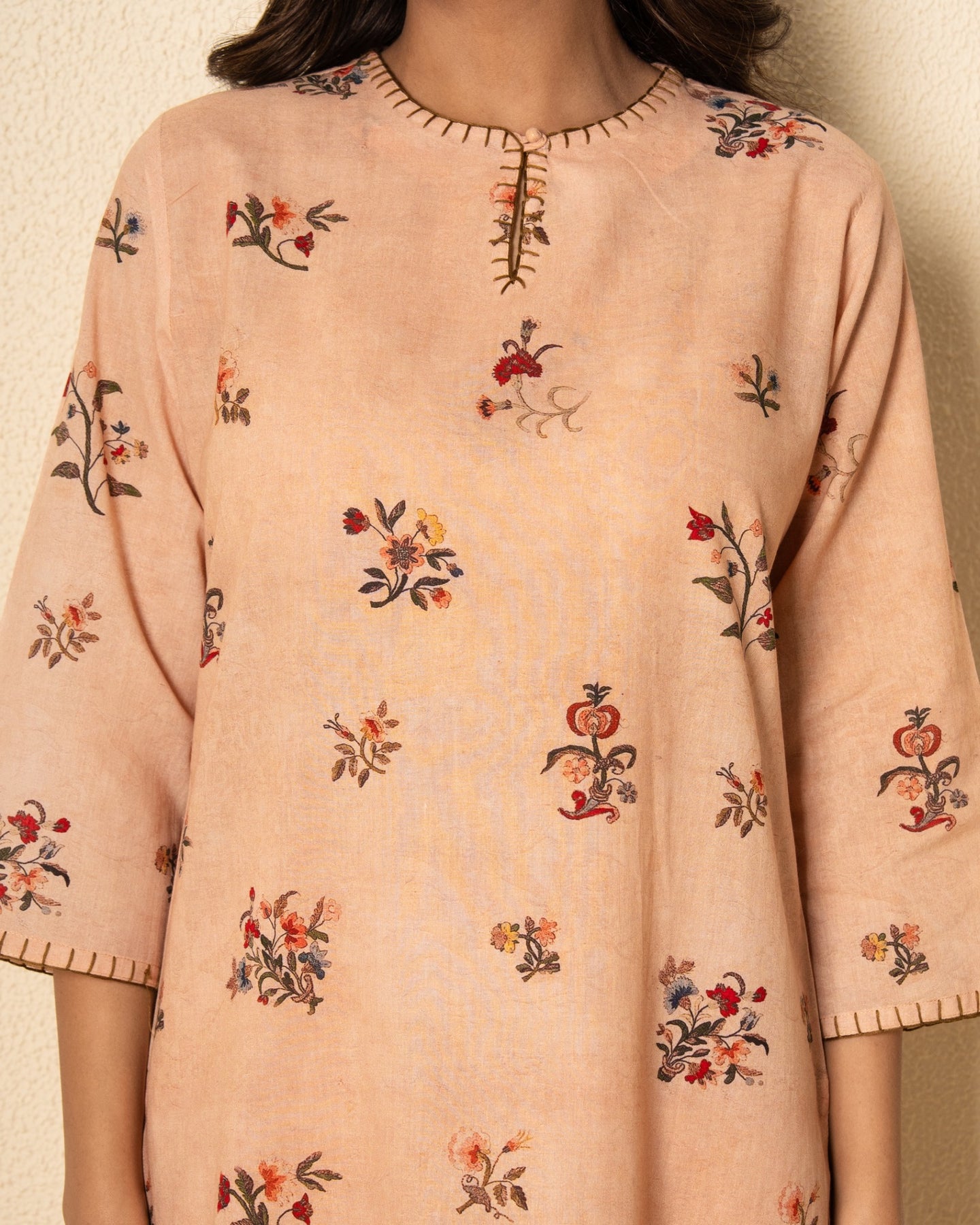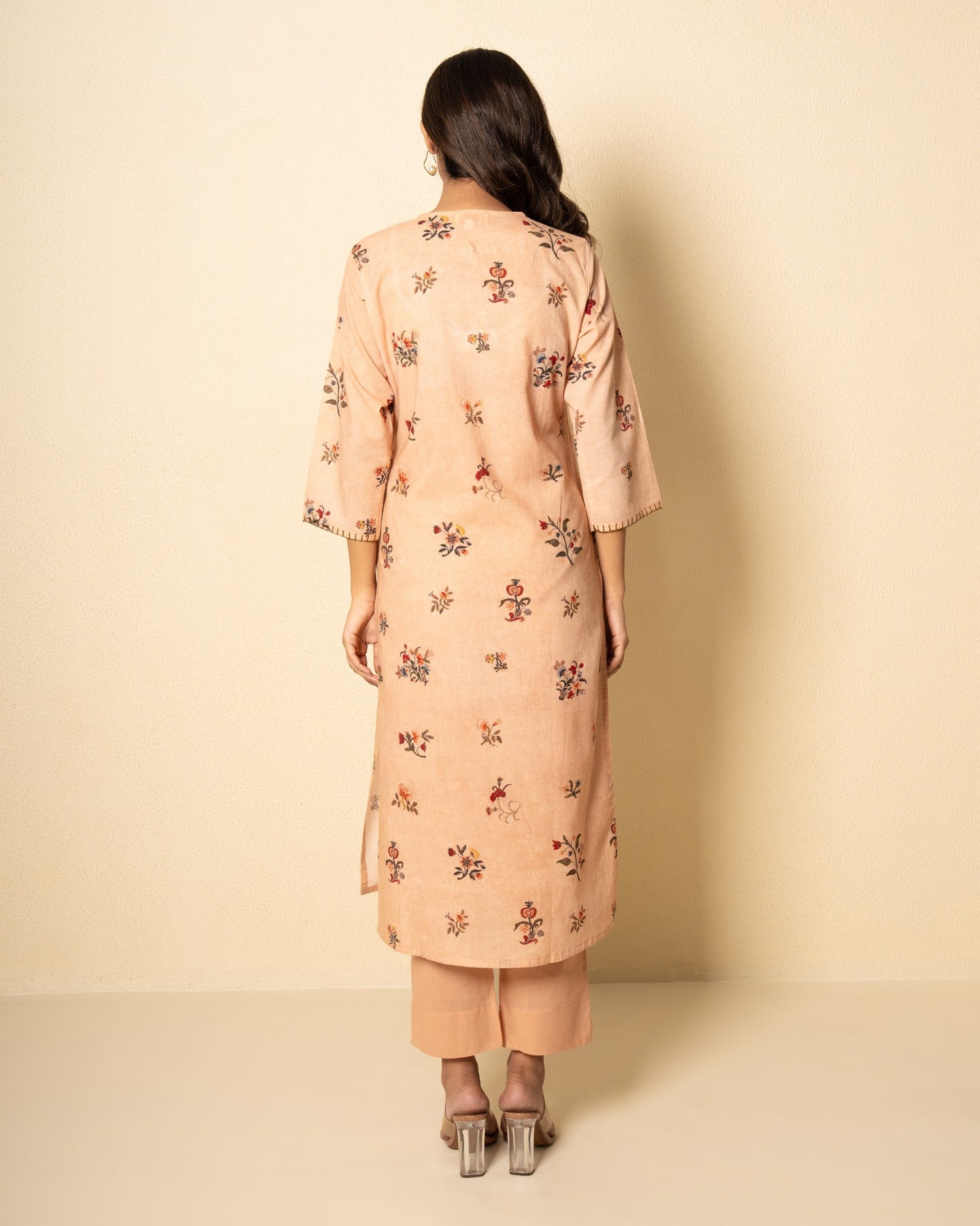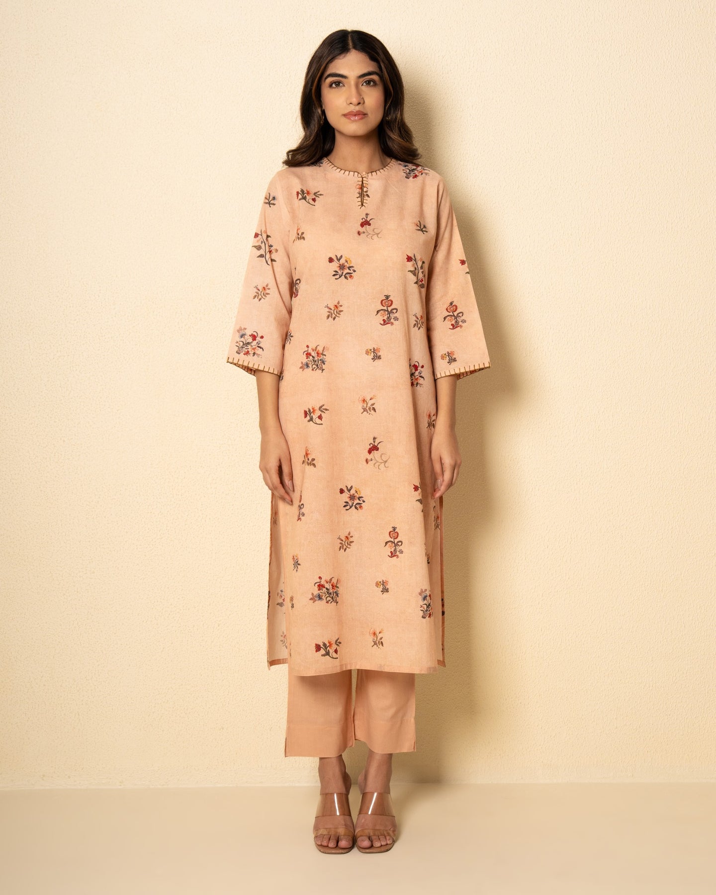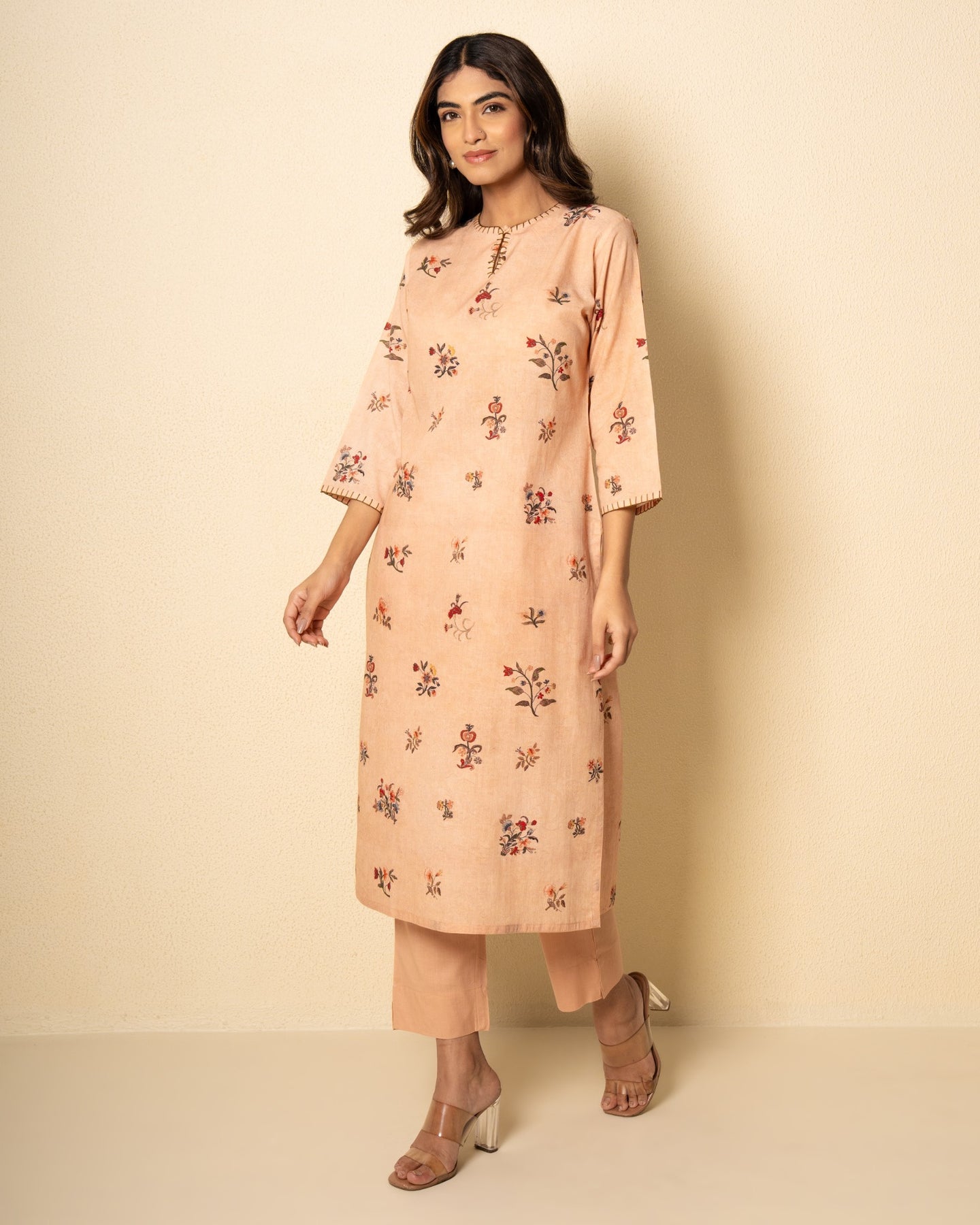 A refreshing blend of comfort and elegance, our soft salmon kurta set is crafted from breathable cotton in a delicate pastel hue. The kurta features a graceful keyhole neckline with three-quarter sleeves and side slits for effortless movement. Adorned with an all-over floral digital print, it brings a subtle charm to everyday dressing. Intricate blanket stitch detailing along the neckline and sleeves adds a handcrafted touch. Paired with solid matching cotton pants, this set is perfect for relaxed yet refined styling.