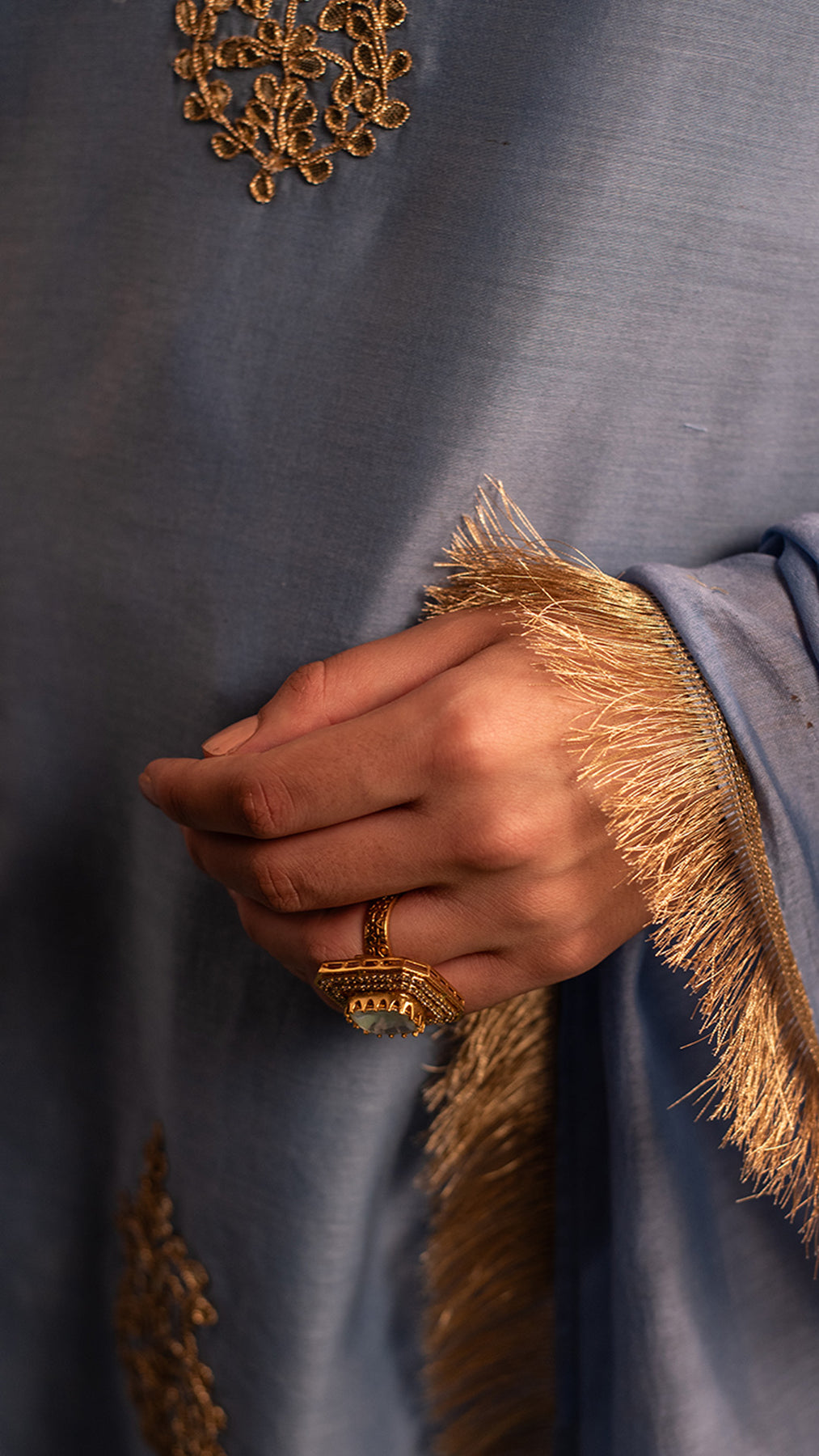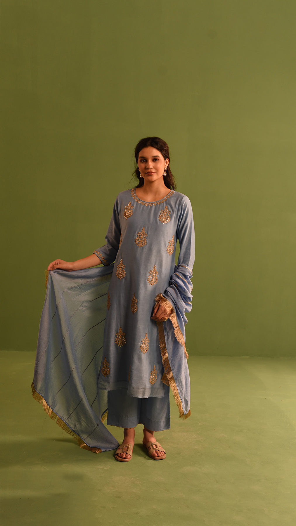 The Blue Gray Suit Set is a blend of elegance and tradition, crafted from chanderi fabric in a sophisticated blue-gray hue. The kurta features a round neckline, three-quarter sleeves, mulmul lining, and intricate gota patti work all over, exuding timeless charm. Paired with matching cotton pants adorned with bijiya lace on the edges, it offers a refined look. The set is completed with a matching chanderi dupatta, beautifully embellished with gota detailing and fringe gota lace on the borders. Ideal for festive occasions, this ensemble radiates grace and sophistication.