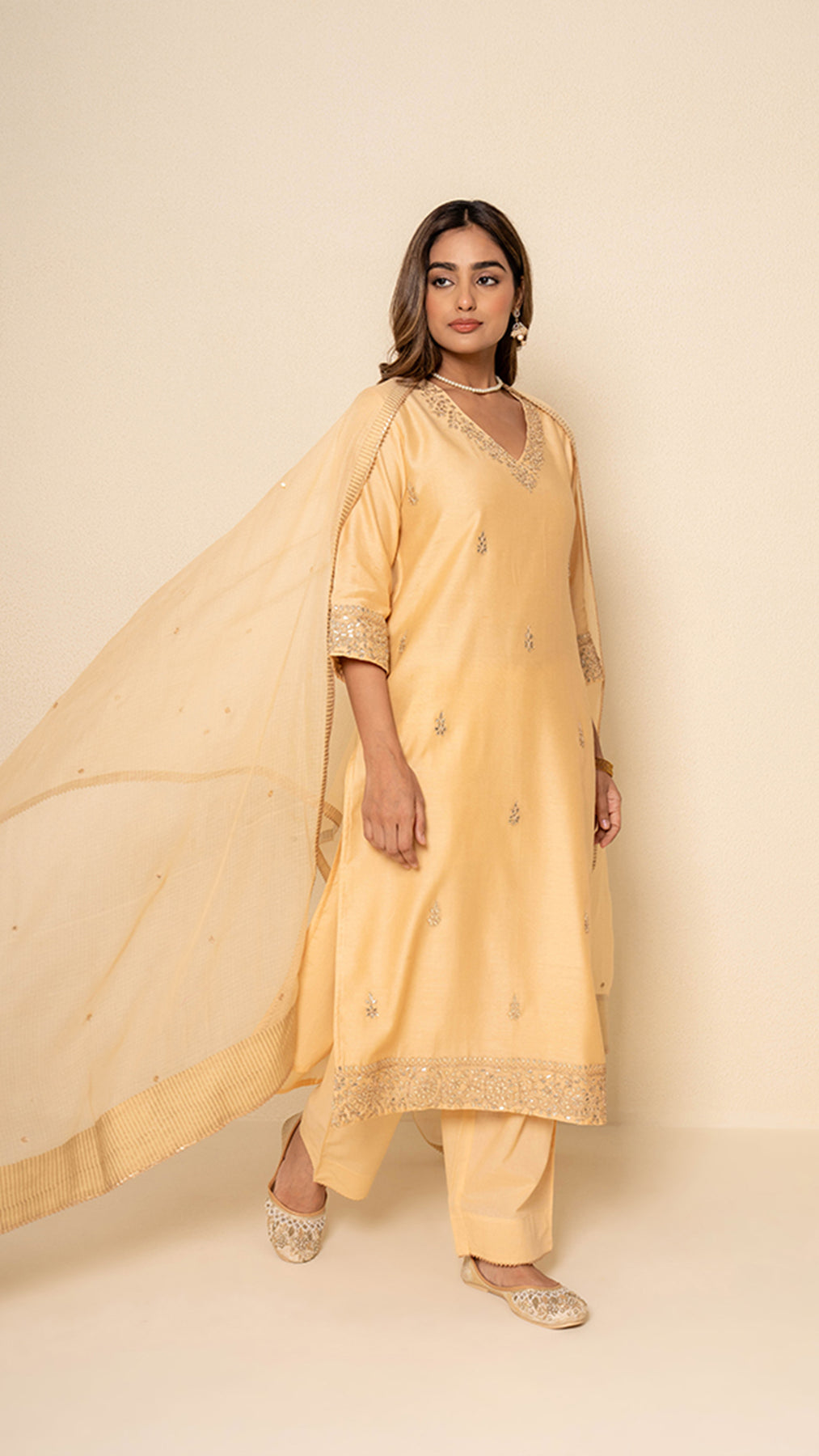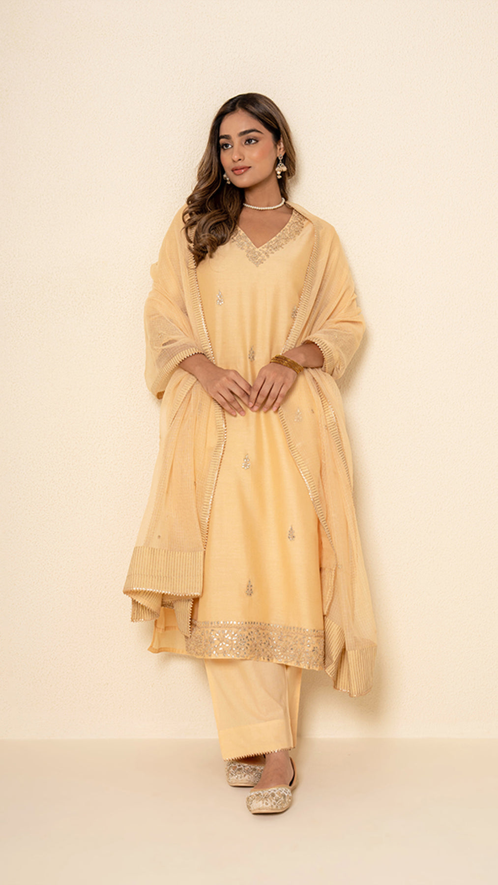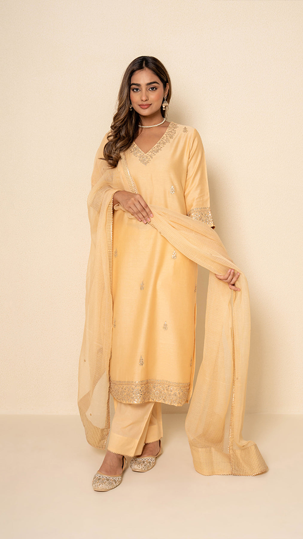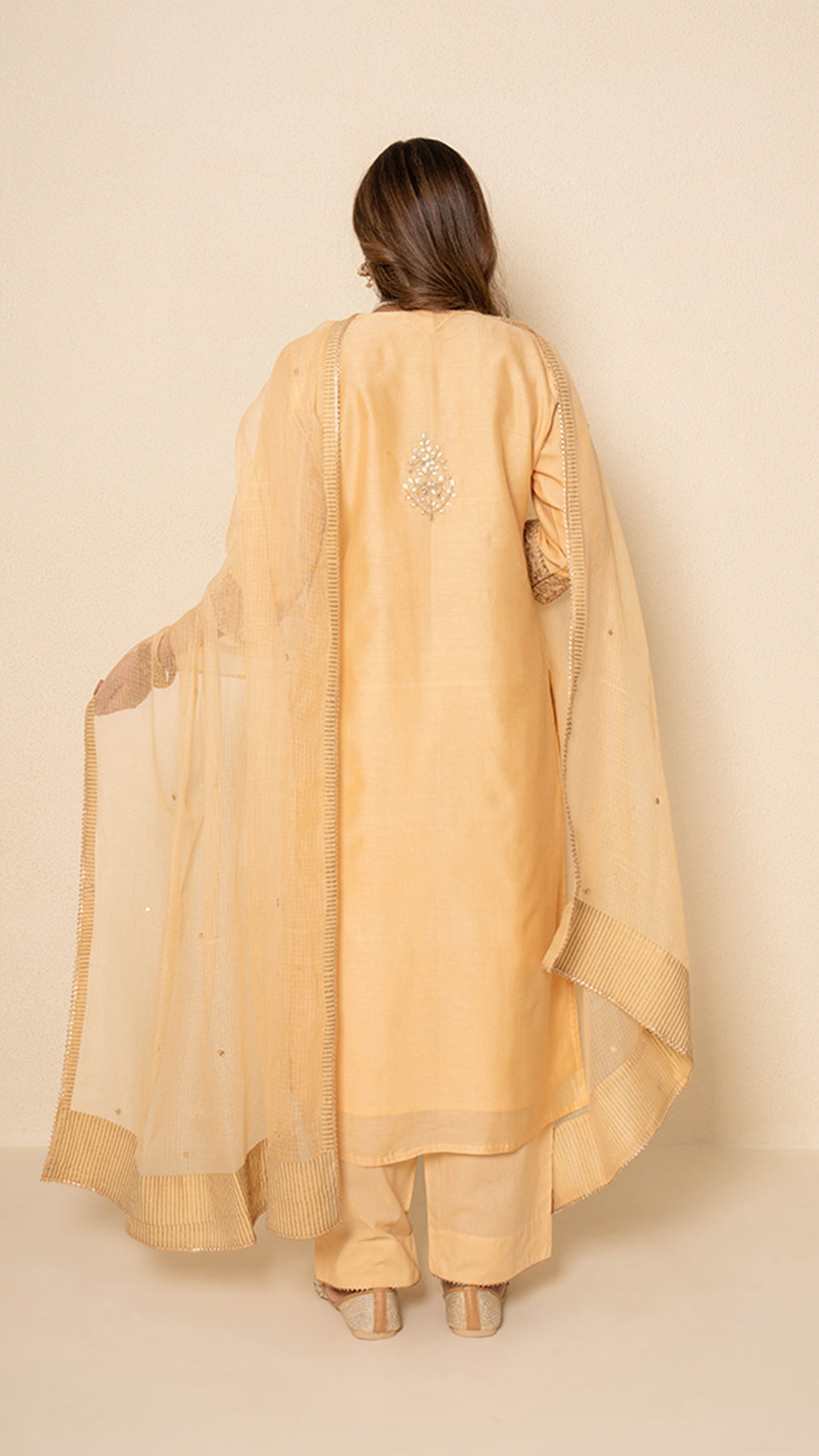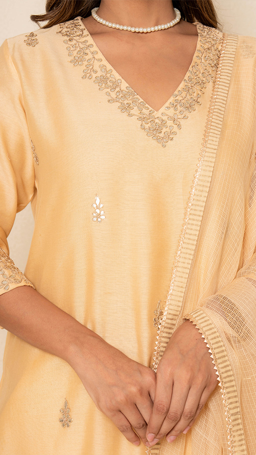 Radiate festive elegance in our Luxe Cream Chanderi Suit Set, a timeless blend of tradition and charm. The solid straight kurta in cream color has mulmul lining and features a flattering V-neckline, three-quarter sleeves, and intricate gota patti work adorning the neckline, hem, bodice, and sleeves. Paired with matching cotton pants finished with delicate bijiya lace, it adds a refined touch to your look. The ensemble is completed with a Kota Doria dupatta showcasing graceful gota patti accents and bijiya lace borders. Perfect for festive celebrations and special occasions alike.